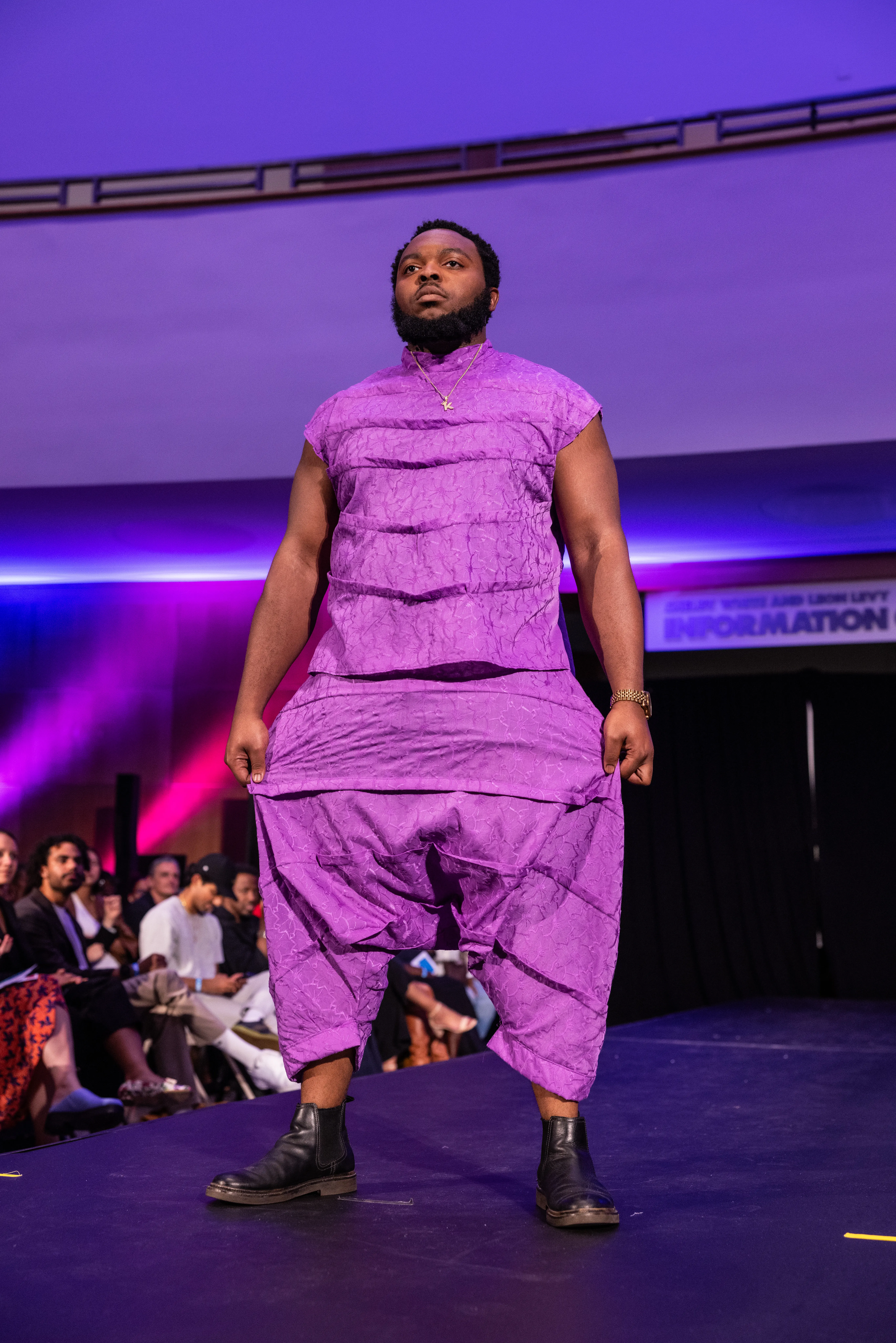 Ronen, who had never sewn garments before, created intricate horizontal pleats throughout his purple ensemble—a dramatic silhouette that challenged Western fashion conventions while honoring Indigenous and African aesthetics.