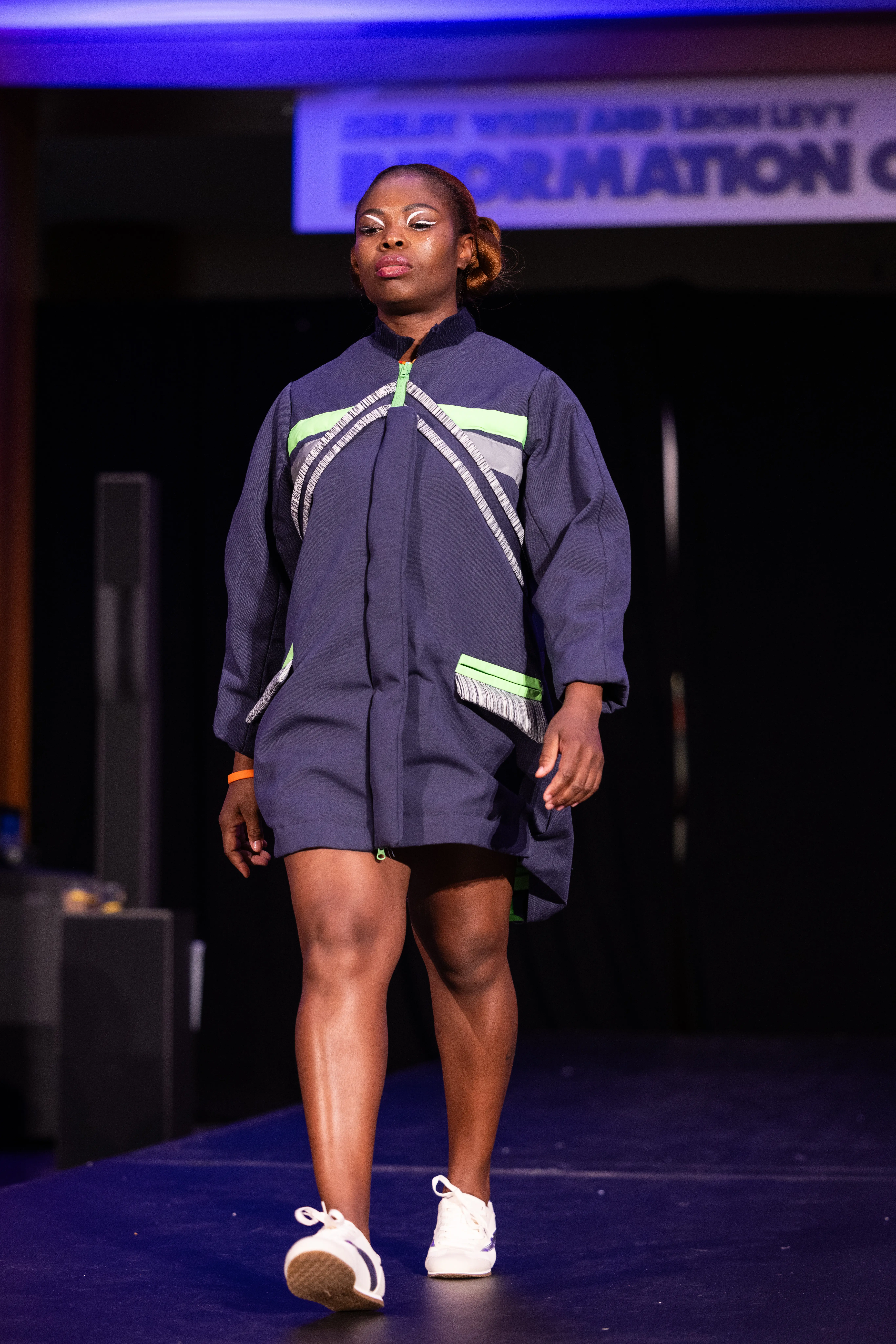 Despite not completing my fourth look, I made it to the show with three emergency services-inspired designs that turned firefighter gear into street-ready fashion. High-visibility tape and reflective accents gave my navy jacket an urban edge that celebrated women’s strength in protective roles. Walking the runway alongside models in my designs was exhilarating—a reminder of what’s possible when we face our doubts and embrace the work.