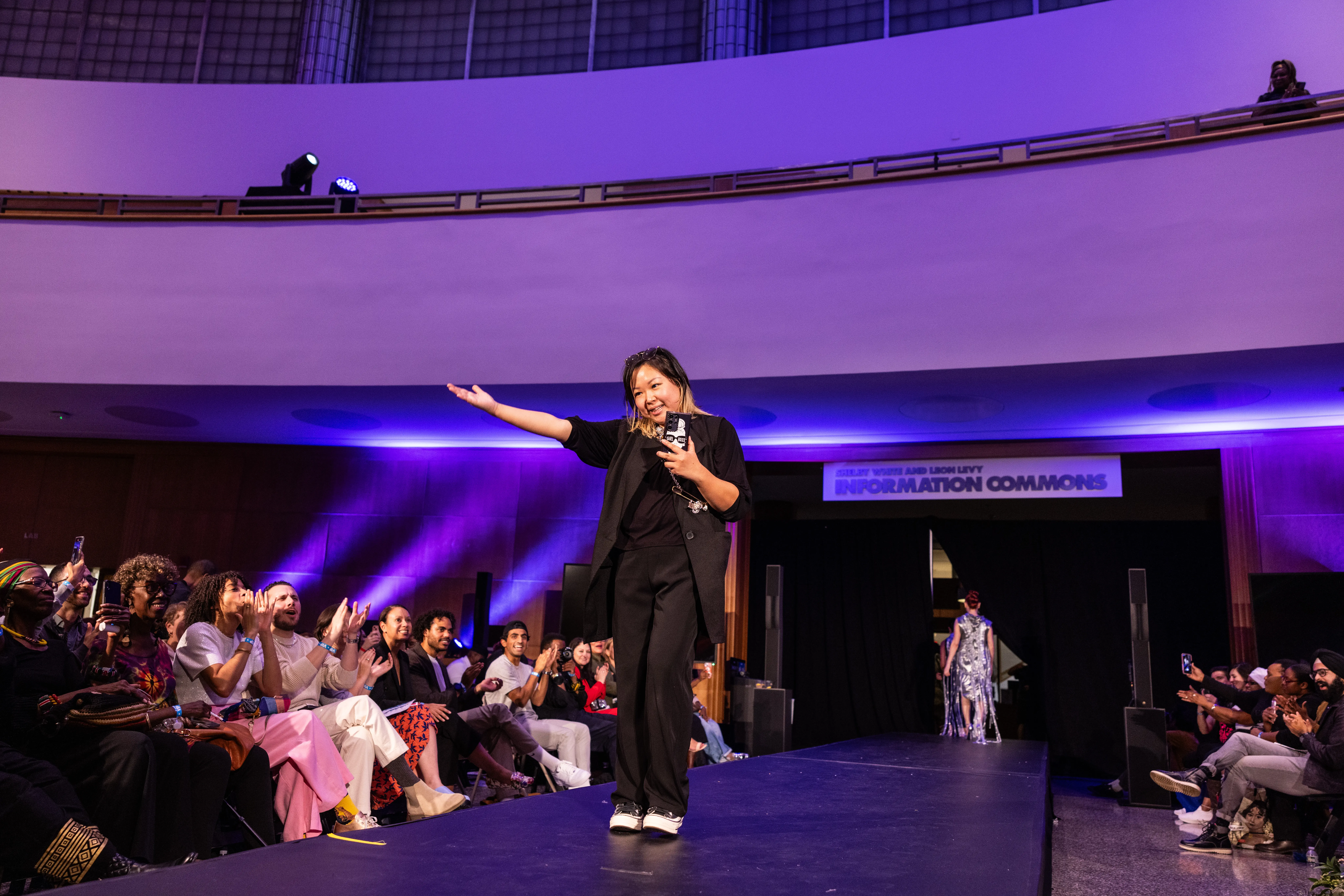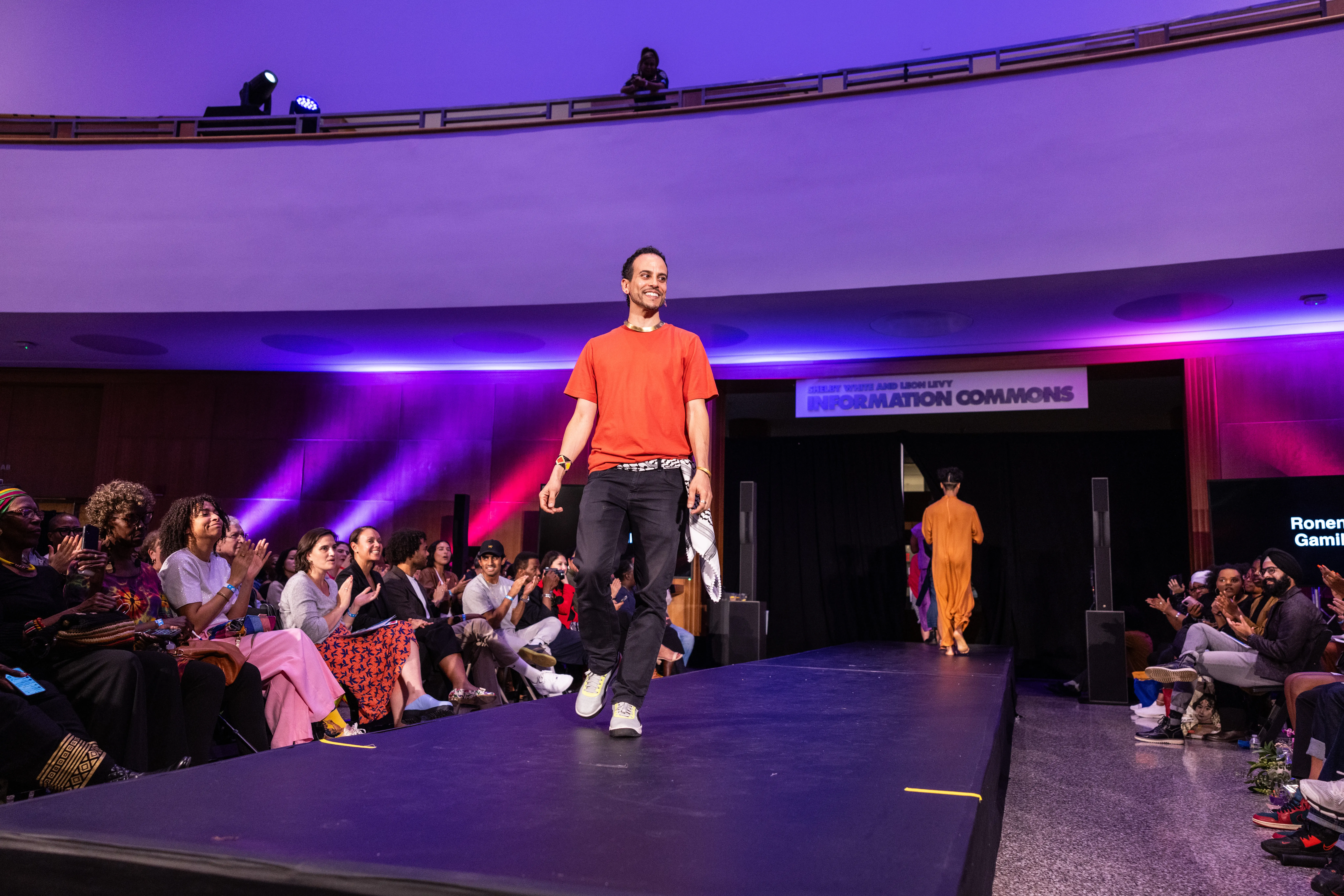 The library hall’s transformation from a reference desk and patron sitting area into a professional runway venue was remarkable. Yet he questioned whether this focus serves all designers: “I don’t know how typical this kind of show is in the fashion industry. For garment makers, runway shows aren’t always central, but in this program, the show is a big focus.” The emphasis on designer-as-star particularly unsettled him: “There’s this idea of the designer on a pedestal, and while that appeals to some, I wasn’t prepared for walking the runway myself. I was thinking, ‘Why do I have to do this?’”